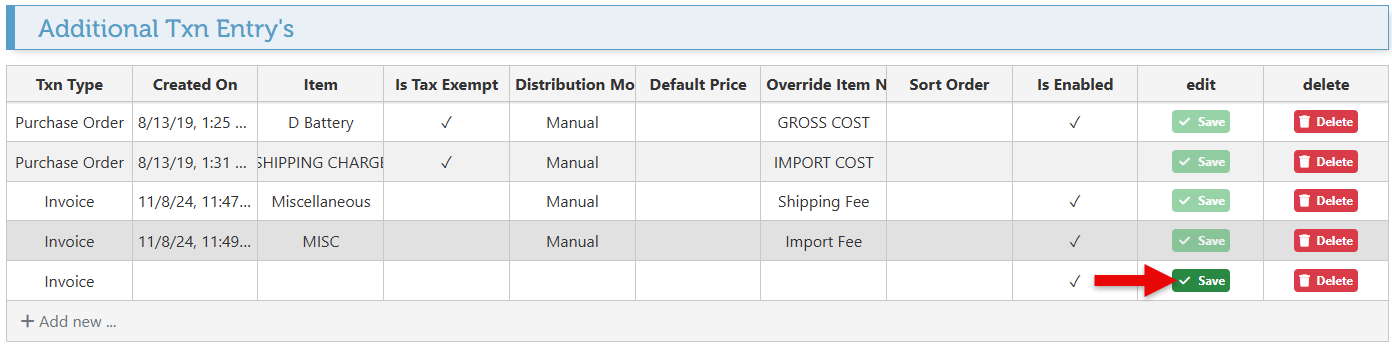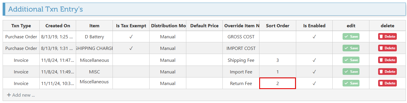 The Additional Transaction Entries feature enables items to be added to the default layout of a transaction, allowing for the inclusion of specific items or fees when necessary. This feature is commonly utilized for shipping fees and related costs, as it enables the efficient assignment of prices to predefined fees.