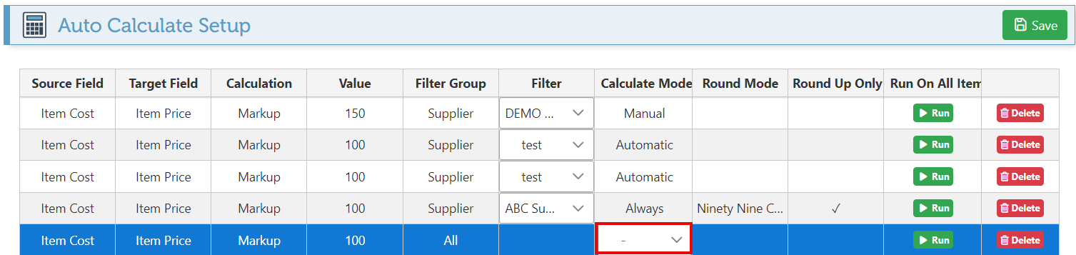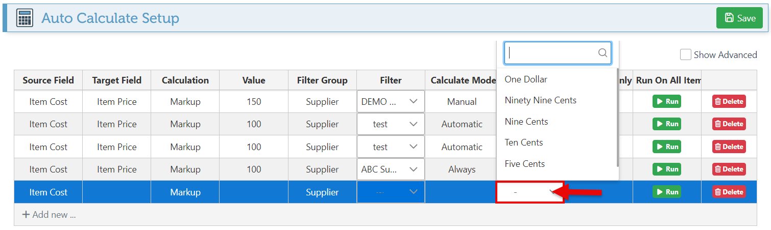 Select a Mode in the Calculation Dropdown menu. Options include: “Markup”- value percentage will be added to the source field; “Markdown”- value percentage will be subtracted from the source field; “Fixed”- destination field will be changed to a fixed amount; and “Add”- value will be added to the source field.
