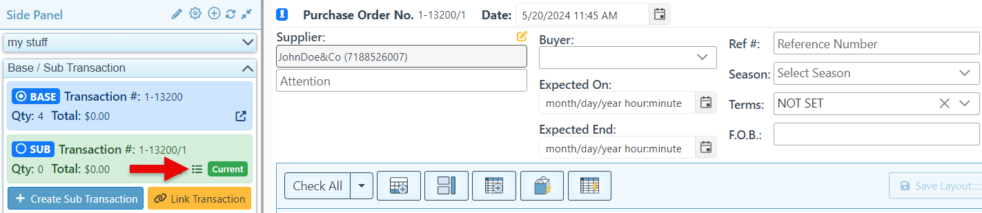 Navigate to the “Base/ Sub Transaction” tab in the side panel, and click “Split.” This will create a duplicate of the purchase order as a sub-PO.