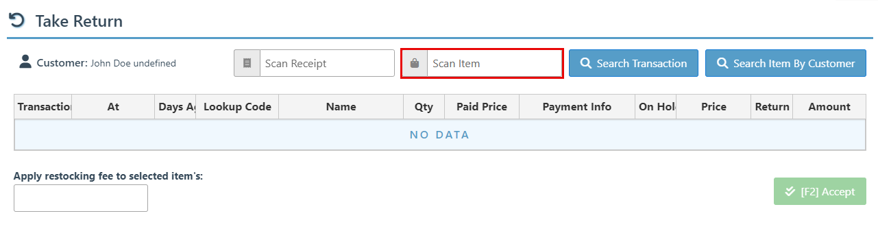 Scan a transaction in the receipt scanner bar to load the transaction from which items can then be selected for return.