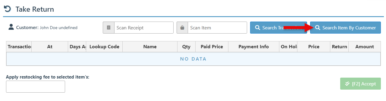 Click “Search Transaction” to open a customer transactions list from where a transaction can be selected. Once the transaction loads, items can be selected for return.