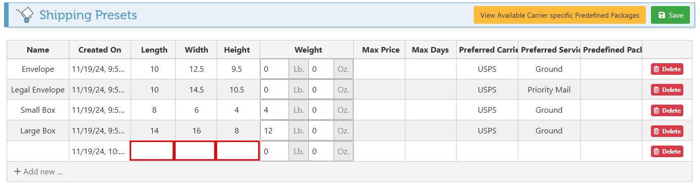 To delete a specific Shipping preset, click the “Delete” button at the right of the relevant row.