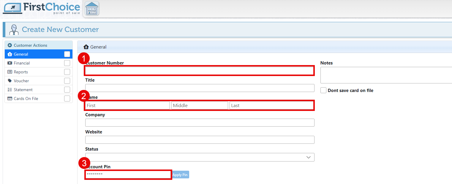 In the General tab, enter the customer's number, name, and account PIN. If applicable, enter the Customer Title, Company name, and Website details.
