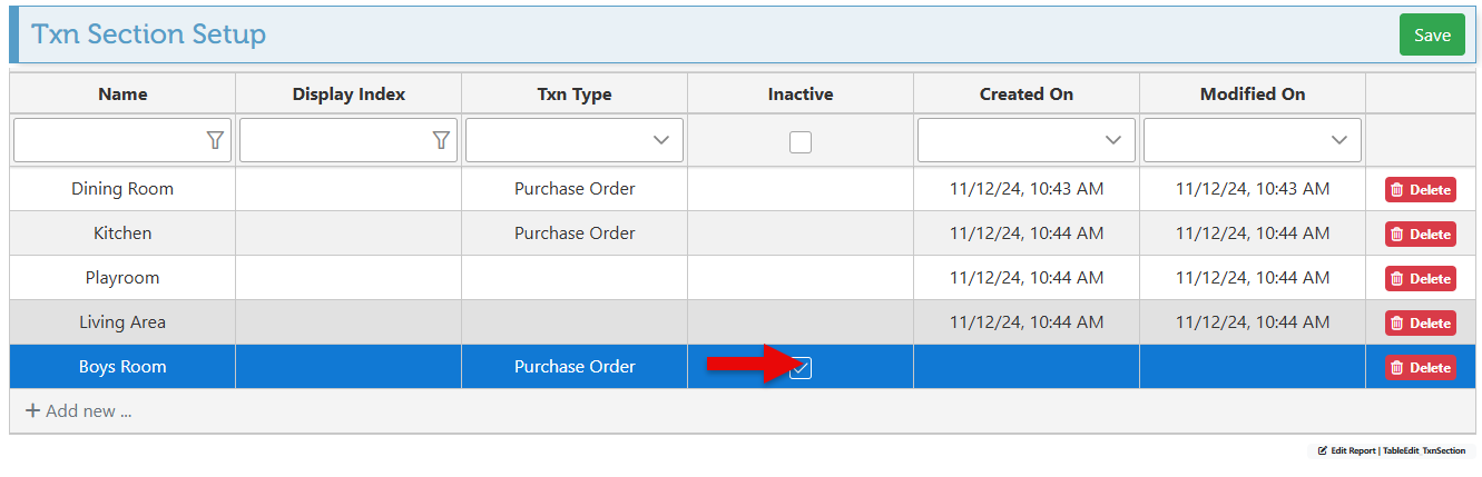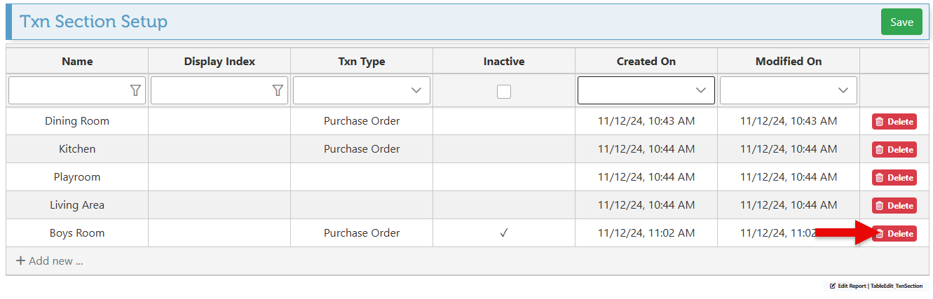 Transaction sections enable the items on invoices, purchase orders, and other transactions to be organized and grouped according to a specific item detail. This feature is most commonly used to group items according to the room they are designated for, although it can be utilized for other attributes such as item category, type, etc. Below is a guide on adding and using the sections feature in transactions, followed by instructions on creating a new section that will automatically be added to the sections dropdown on the transaction page.