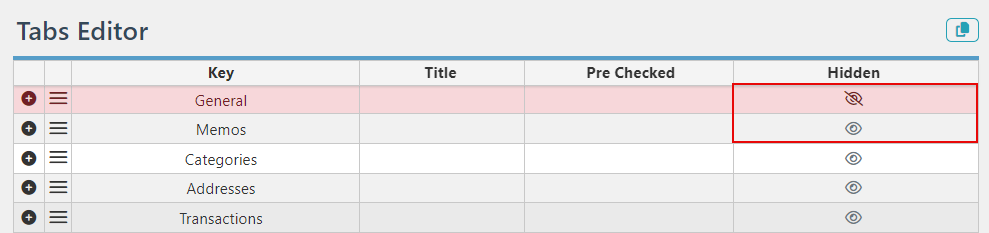To add or remove tabs from the Customers Actions menu, click on the hidden icon on the tab to hide or unhide it, according to preference.