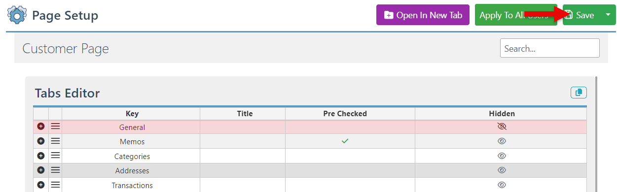 Select tabs in the Pre-Checked column to set them to load automatically on the customer actions page.