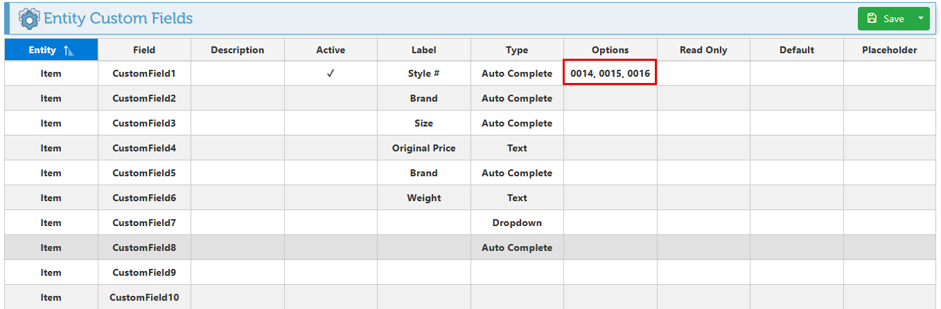 Before configuring the custom field, ensure that the row is designated for item custom fields by checking if the entity field is set to "Item.”