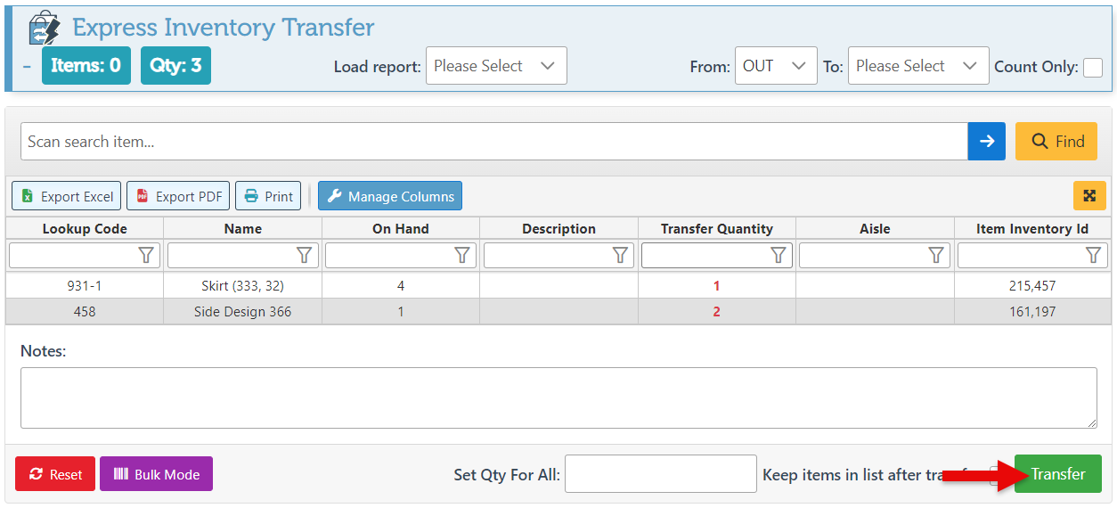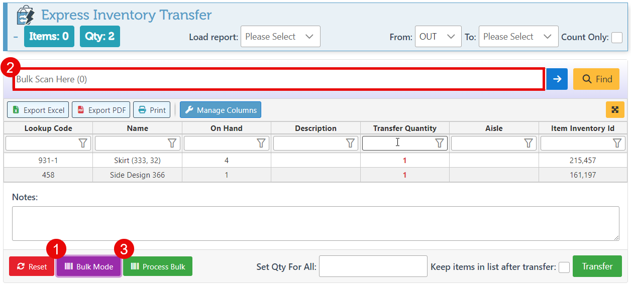 To scan items in bulk, click the “Bulk Mode” icon and proceed with scanning. Once the items have been scanned, click “Process Bulk” to add them to the transfer list and process the inventory.