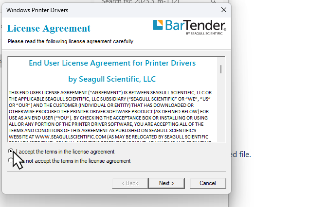 To complete the printer installation, click “Next" and “Finish” in the following three Seagull Driver Wizard popups.