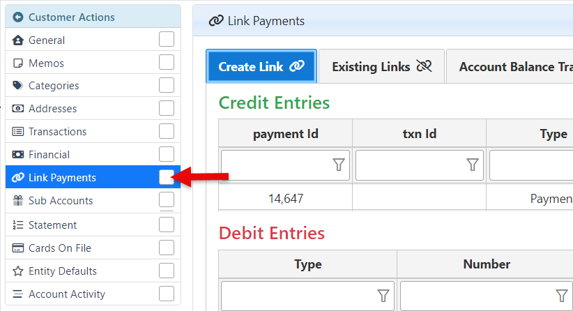 To link the credit to a specific transaction, click the “+” Icon on the desired debit entry to create the link.