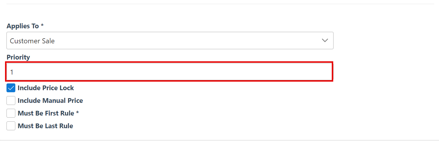 To ensure this rule takes precedence over any other price rules, select the "Must be First Rule." This will ensure that the specified rule is applied first and that all other price rules with higher priority are disregarded.
