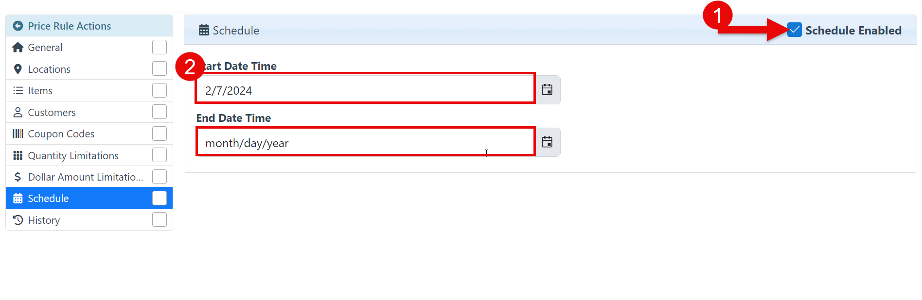 Navigate to the “Schedule” tab in the Price Rule Actions to set a scheduled start and end date for a price rule. Select the 'Schedule Enabled Checkbox” and enter a start and end date in the bars.