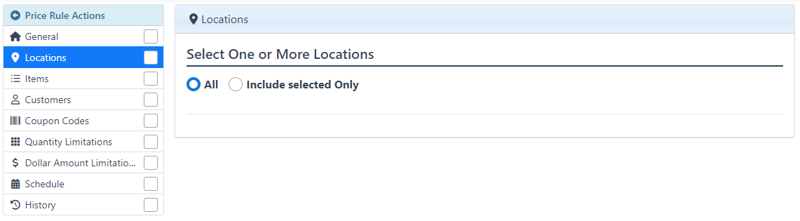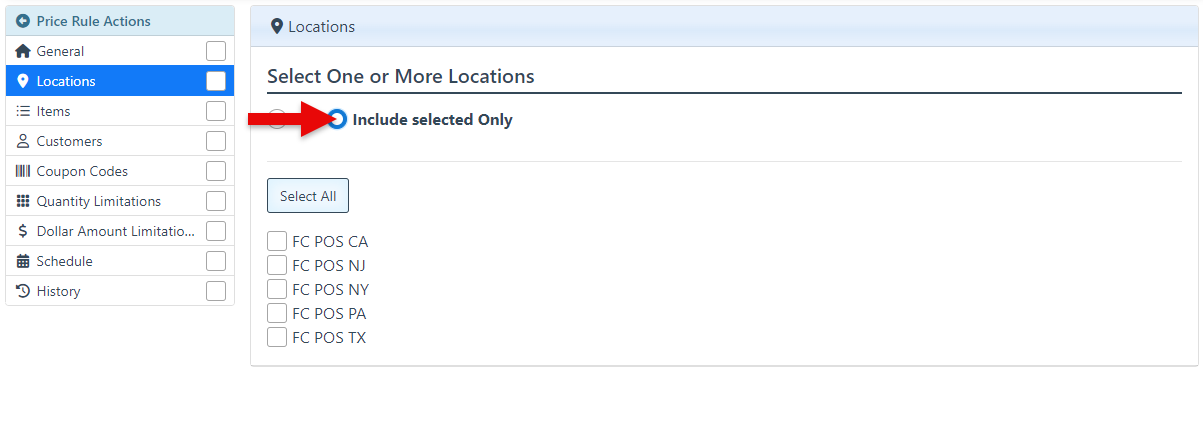 By default, price rules will apply to all locations. To select specific locations, click the "Include selected only" checkbox and select the desired locations from the list.