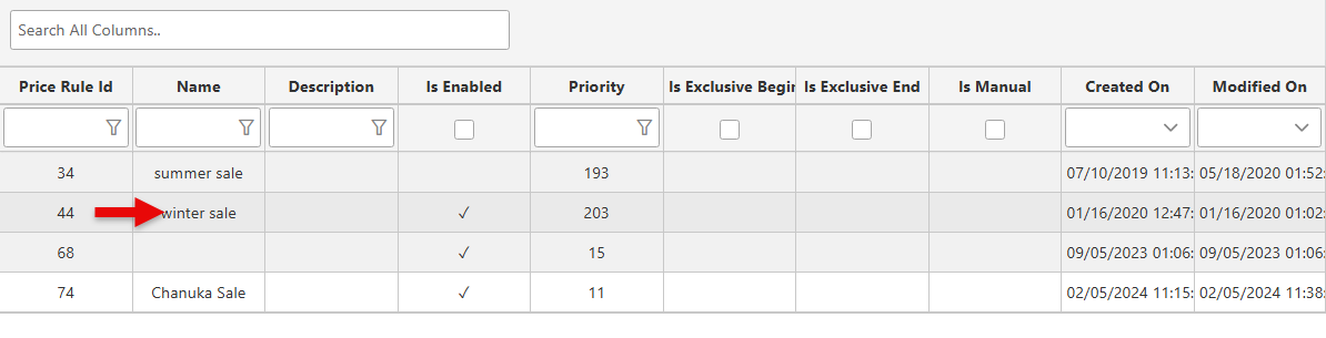 The list will display all price rules including information such as the price rule ID, name, description and created and modified dates.