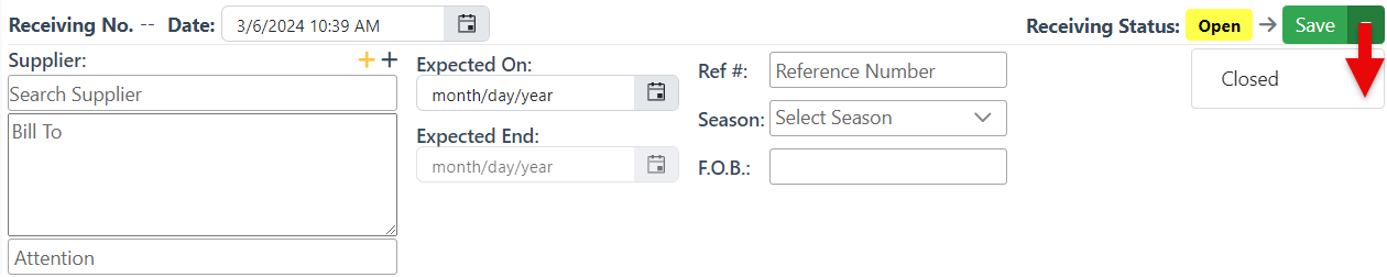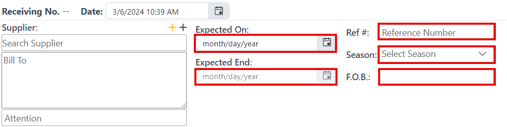 Enter applicable details in the designated bars, including “Expected On and End,” “Reference #,” “Season,” and “F.O.B.”