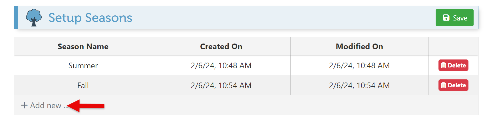 To delete a season, Click “Delete.”