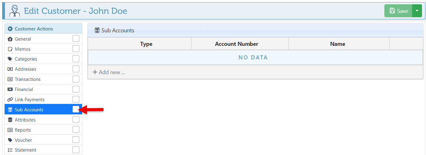 Navigate to the “Sub Accounts” tab in the Customer Actions menu on the left.