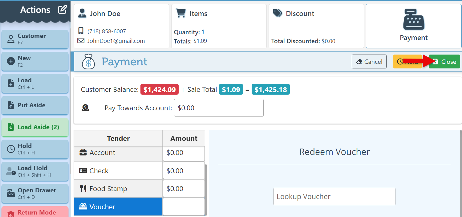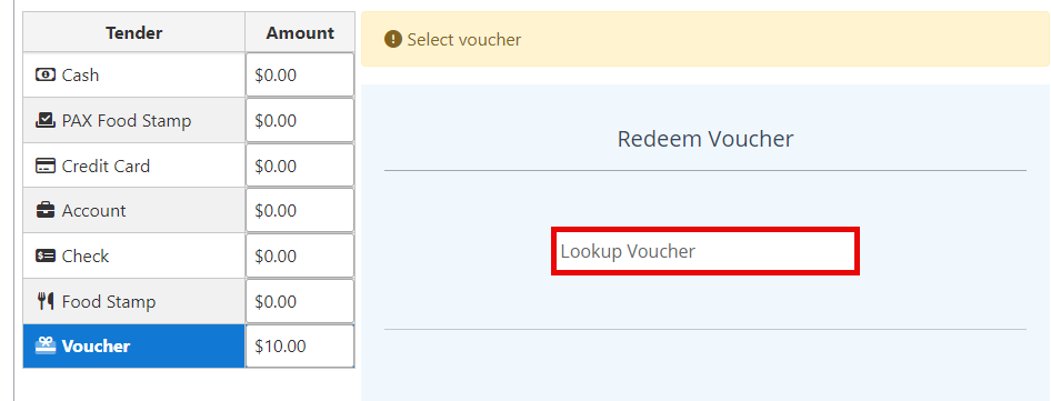 To check the status of a specific voucher, navigate to the payment tab at any point during checkout, enter the voucher number in the “Lookup Voucher” field, and click the Enter Key.